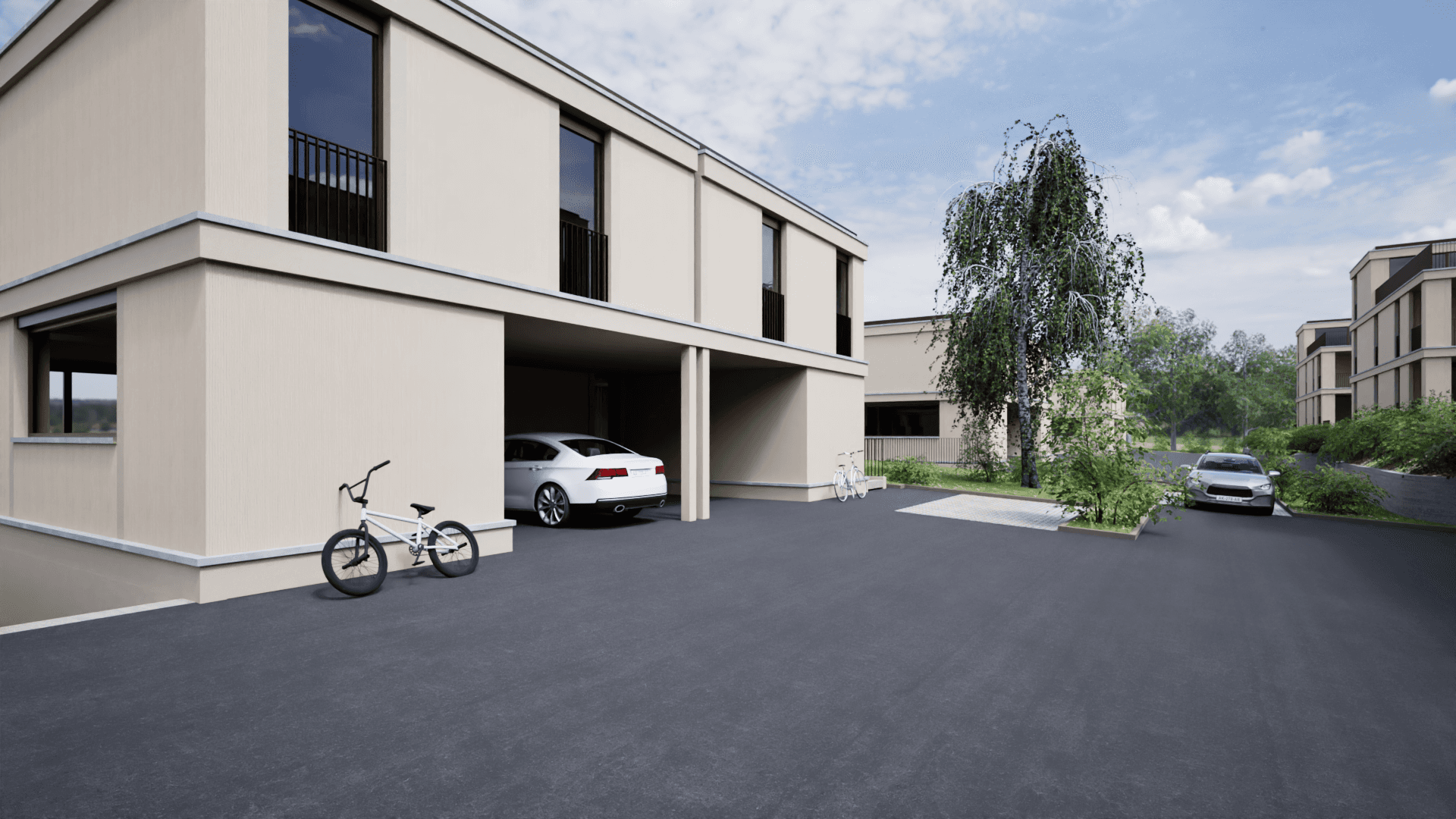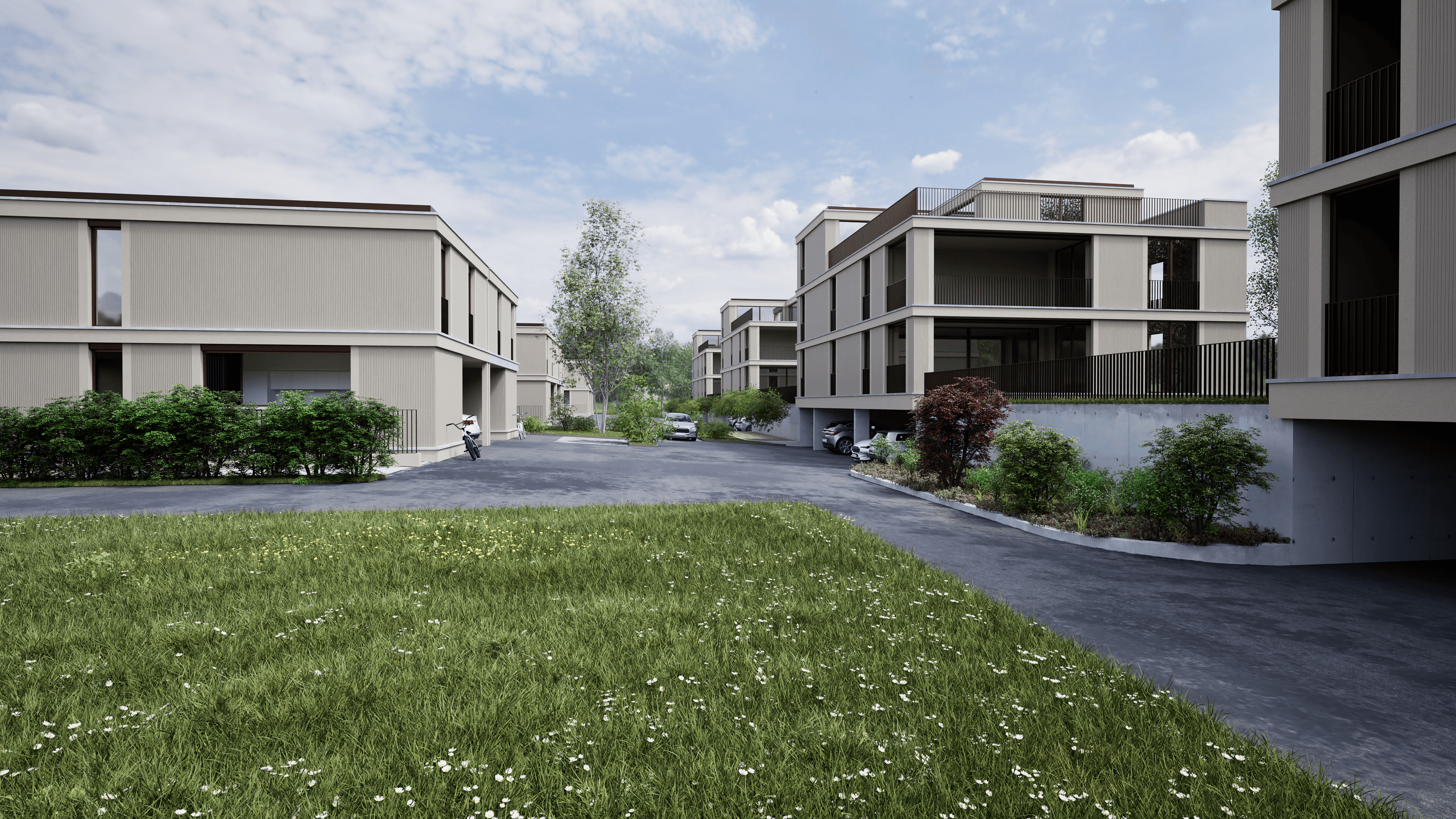 Stationnement et accessibilité : Le quartier est équipé de places de parc couvertes et extérieures, intégrées discrètement pour préserver l'esthétique des lieux et la sécurité des piétons.